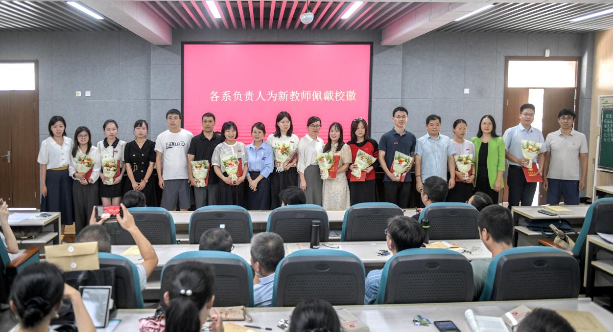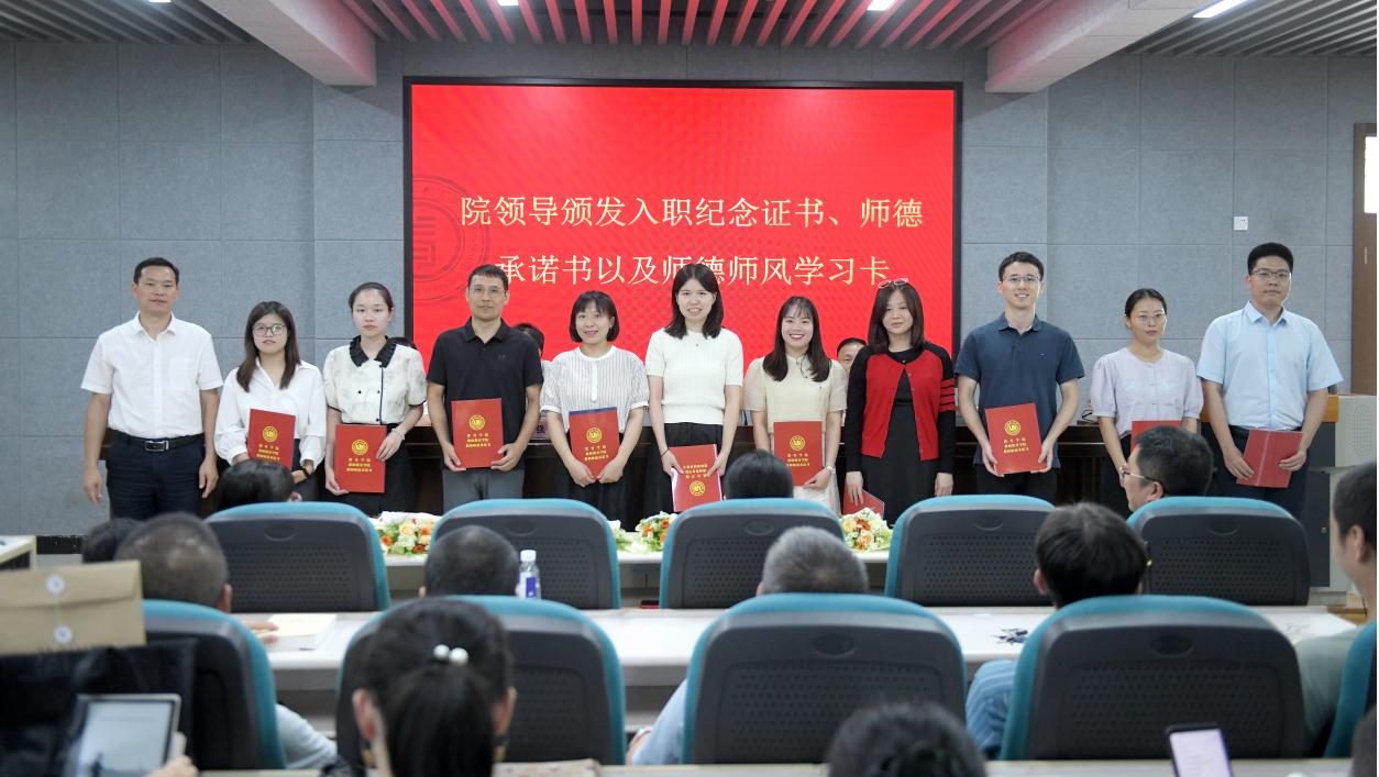 隨后,學院舉行新教師入職儀式。何書記為毛鵬程等11位新入職教師頒發(fā)入職紀念證書、教師師德承諾書、師德師風建設制度摘要等,并合影留念。各系、科室負責人為新教師佩戴校徽,送上鮮花,表達對新入職老師的熱烈歡迎和殷切期望。入職儀式后,全體教師起立,進行教師宣誓儀式,重溫教師誓詞。