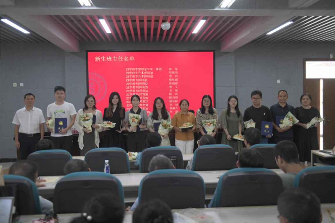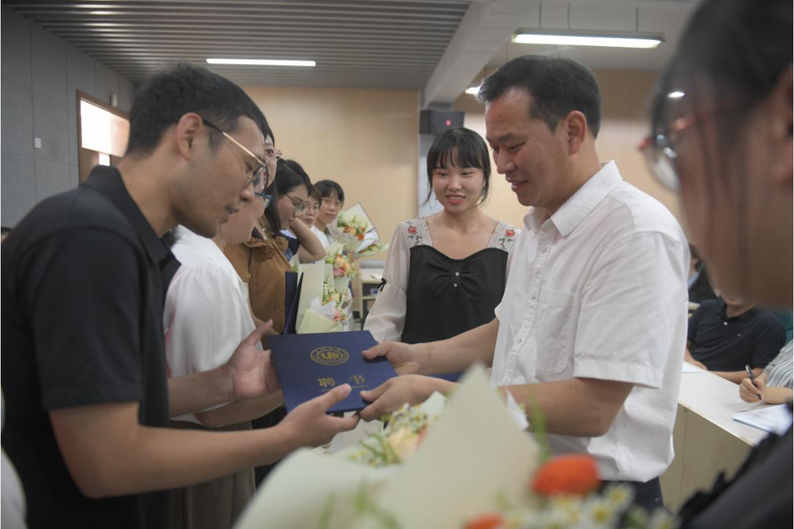 新教師入職儀式后,學院進行了新生班主任聘任。章園園副書記宣讀2023級新生班主任聘任名單,何書記為龔婧等26位教師頒發(fā)新生班主任聘書,并合影留念。