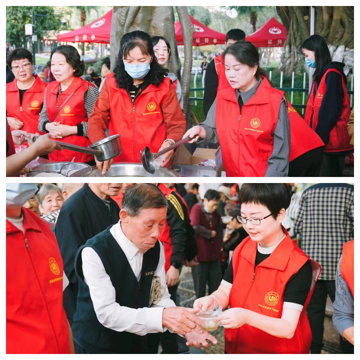 上午7點,溫州大學離退休第十黨支部十八位志愿者,整整齊齊地穿著紅馬甲,早早地來到紅日亭活動現場。在紅日亭義工隊負責人的帶領下,大家開啟了有序的工作:拉橫幅、搬桌椅、擺碗筷、煮湯圓等等,忙得不亦樂乎。此時,大榕樹下已經排起長長的隊伍。在貧困老人、環衛工人、殘障人士們期待的目光中,大家把一碗碗熱氣騰騰的湯圓送到他們手中。他們回應的一張張燦爛的笑臉,讓志愿者們內心激動不已。兩個多小時的時間里,志愿者們一直沒有停歇,直到五百多份湯圓全部贈送完畢。八十多歲的老黨員陳秀士從一大早來到活動現場就開始認真維持活動秩序。雖然同志們幾次勸他不要太勞累多歇歇,但是他始終堅持,直到活動結束才坐下來喘口氣。溫州大學老師們無私奉獻的精神得到了紅日亭義工隊的一致稱贊。