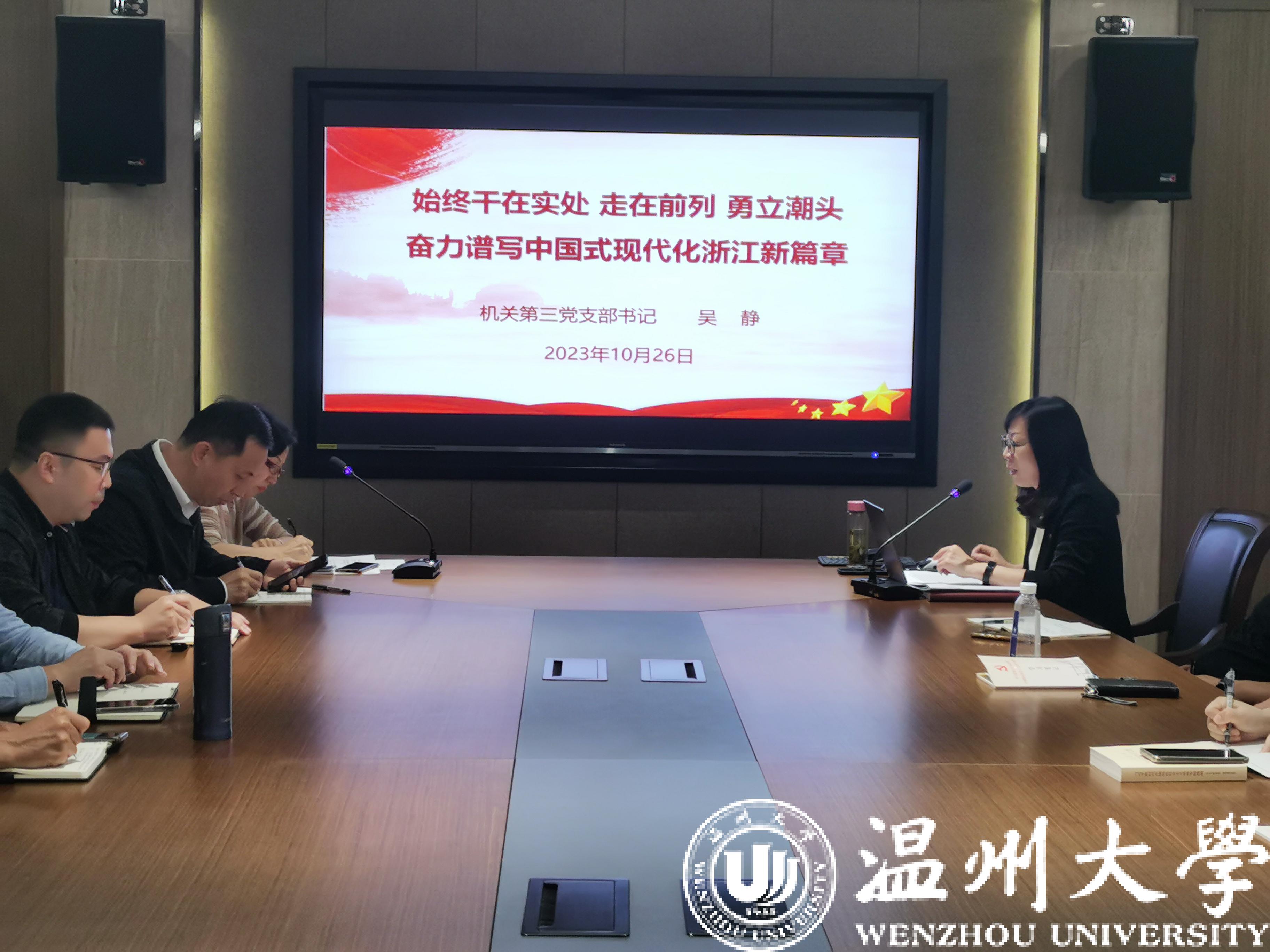 第三黨支部書記吳靜以《始終干在實處走在前列勇立潮頭奮力譜寫中國式現代化浙江新篇章》為題,領學習近平總書記考察浙江重要講話精神。她在系統梳理習近平總書記浙江足跡和此次浙江考察調研的基礎上,重點圍繞習近平總書記對浙江提出的五點要求進行了詳細地解讀和闡述。她指出,習近平總書記考察浙江時的重要講話,內涵豐富、高屋建瓴、思想深邃,為我們做好各項工作指明了前進方向、提供了根本遵循、確立了行動指南。學習宣傳貫徹總書記重要講話精神是當前和今后一個時期各級黨組織的頭等大事和首要政治任務,每一位黨員同志都要迅速行動起來,逐字逐句讀、原原本本悟,學深悟透重要講話的精髓要義、蘊含其中的馬克思主義世界觀方法論,干在實處、走在前列、勇立潮頭。