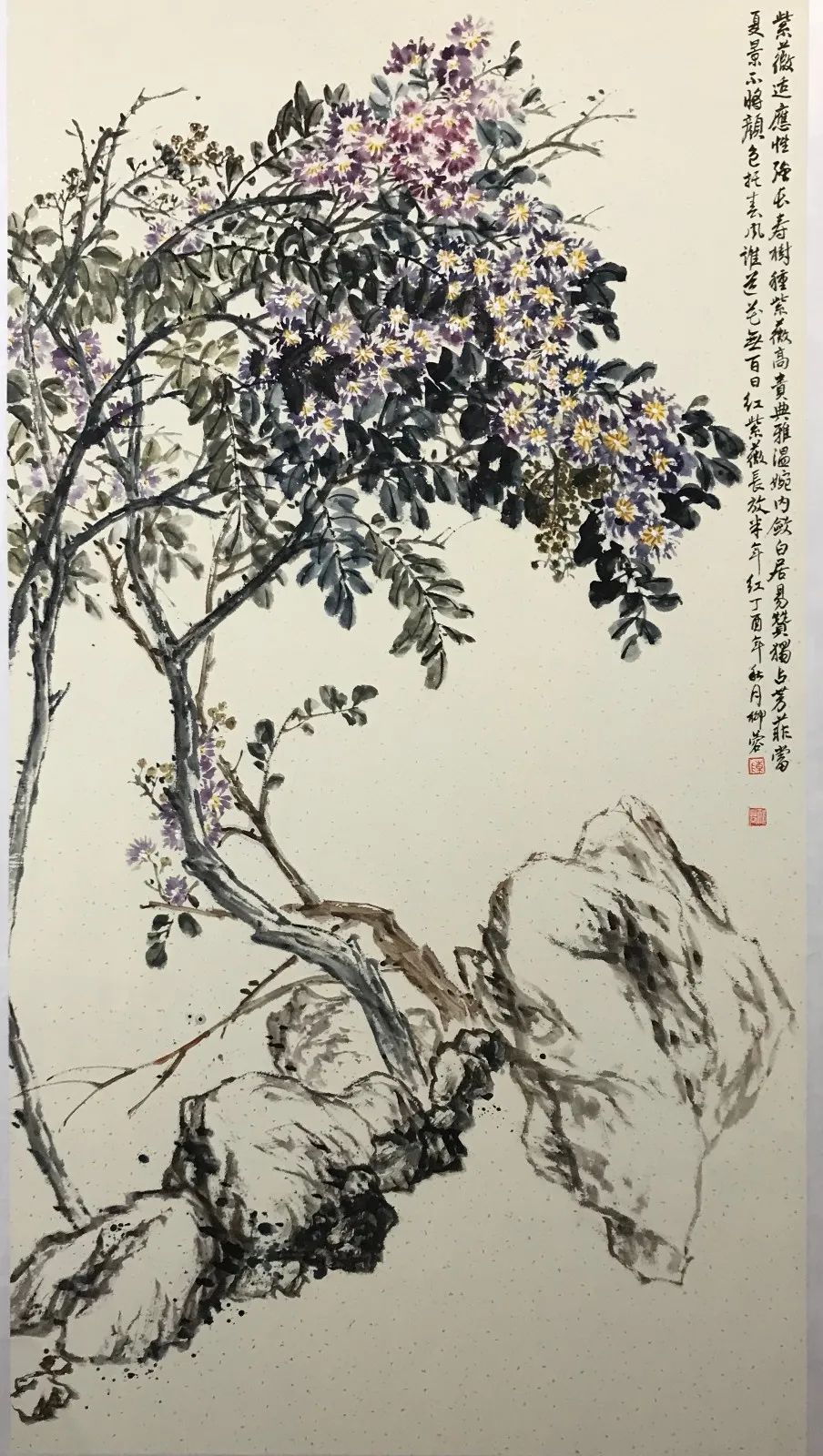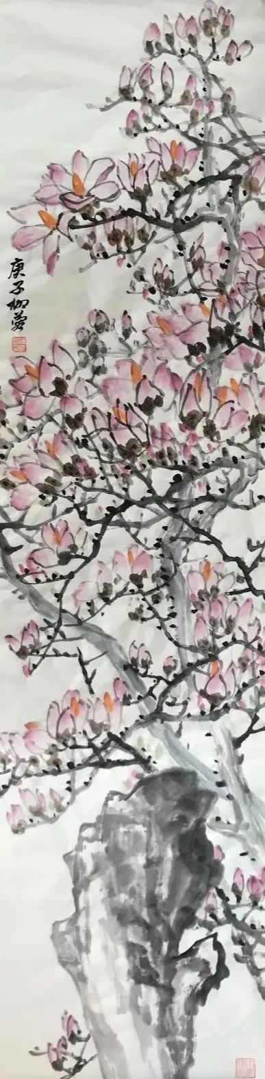清代畫家惲壽平在“南田畫拔”中曾經說:“學晞古不必似晞古,師子畏何妨非子畏,膠柱者之不可與言也久矣”,她深知生活是藝術創作之源泉的道理。她重視對生活的觀察和感受,對生活中的一草一木都傾注著深深的愛心,善于在平凡的生活中發現美。潘天壽先生說:“窮鄉絕壑,籬落水邊,幽花雜卉,亂石叢篁,隨風搖曳,無處不是詩意,無處不是畫意,有待慧眼慧心人隨意拾取之耳。”潘先生的話激發著她的寫生欲望與創作沖動,要做一個慧眼慧心之人必須通過深入生活,進行觀察和寫生,在大自然中尋找靈感,積累素材。她對紫薇、紫藤花情有獨鐘,經過長期的研究和探索,創作了一系列作品和不同題材的佳作,其創作作品大氣、靈動、自帶花香,溫韻中蘊藏著雋秀,古樸中飽含醇厚。