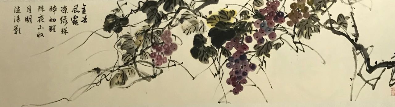 陳柳蓉是一個對生活充滿熱情,對藝術有著執著追求的畫家,她應浙江日報邀請,為上虞蓋北葡萄基地創作了一幅葡萄寫意畫。葡萄是花鳥畫中比較難表現的內容,如同牡丹一樣,色彩容易俗氣,要畫出高雅的格調有一定的難度。她讓葡萄酒在鍋里蒸發,讓它濃縮成稠密精華然后調上顏色,再加入一種堿,表現出來的色彩變化豐富,紫中帶藍,這種著色使得葡萄的顏色顯得即厚重又沉穩,這幅畫看上去既有高雅的格調,色彩漂亮,也更富有神韻。藤蔓線條老而拙,錯綜有致,表現出豐富的層次感,葉片與藤蔓及葡萄之間的關系非常自然,疏密有致,讓人感覺賞心悅目!
